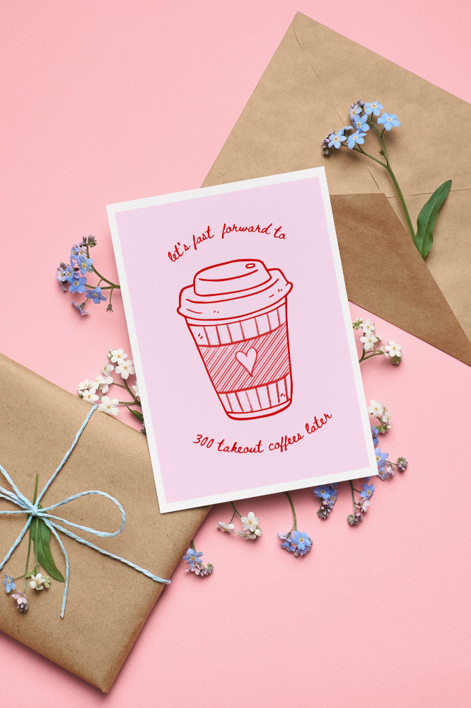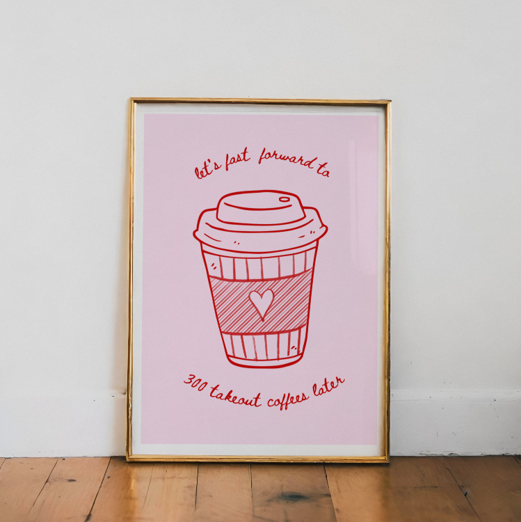 Lyrical quote and art print inspired by Taylor Swift’s 1989 album and lyric from Taylor Swift's song "Is It Over Now?". Featuring the nostalgic line, "Let's fast forward to 300 takeout coffees later," this design is perfect for Swifties who cherish the journey of self-discovery and of course love coffee ☕✨